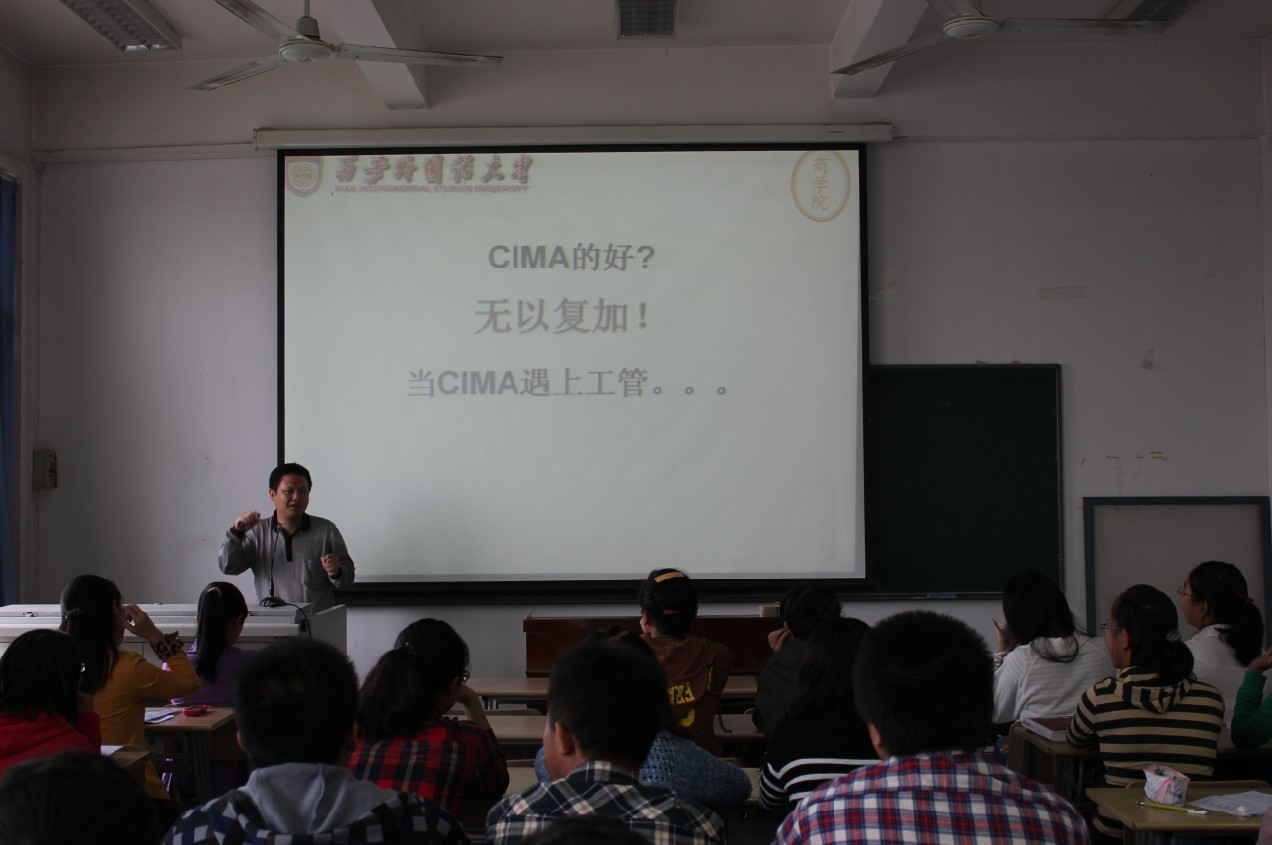 会上杨院长首先向同学们逐一介绍了CIMA方向教学团队老师,对学校学院关于教学管理的规章制度作了详细介绍和说明,并对同学们在自我管理、自我激励等方面寄予深切的期望。教研室主任郑海平副教授对同学详细讲述了工商管理(CIMA方向)教改班的专业培养定位、课程设置和教学基本环节等,同时对工商管理(CIMA方向)教改班的优势从专业复合和融合的角度进行了讲解。会议还邀请了2009级商务英语(CIMA)方向教改班的杨依然同学向在座的同学们分享了她关于CIMA学习的经验与体会。